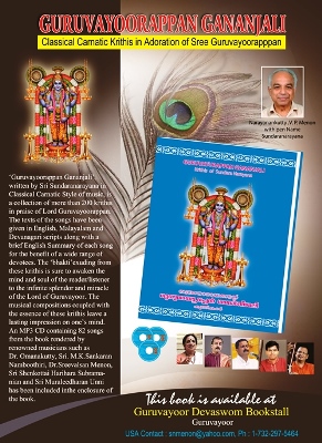 Sundara Narayana, whose real name was Vadakke Palazhy Narayanankutty Menon, entered the music field by accident. He was an environmental engineer by profession and had been a resident of New Jersey, USA for a major portion of his life, with his wife, Dr. Sreedevi, daughter, Dr. Lakshmi and son, Jaykumar, a computer engineer. Sundara Narayana began writing songs in praise of Lord Guruvayoorappan after his 60 th birthday in 1999.It all began with a dream he had, wherein Guruvayoorappan instructed him to write classical songs about Him. Untrained in formal music, he dismissed the dreams at first. However it became a recurring dream which compelled him to try. Inspired by devotion toward Guruvayoorappan he sat down to write his first song starting with “Hari Om Narayana”. To his own wonderment words came out of his mind as if “a tap was opened”. Since then he has composed over 220 songs as well as a dance-drama, Manjulacharitham, one of Guruvayoorappan's legendary miracles. All his krithis are in Sanskrit, Malayalam or Manipravalam (Sanskrit- Malayalam). A few are in Hindi. Some of the songs he composed were Bhajans and a few were Thiruvathira songs. Most of the songs were in praise of Guruvayurappan. He also wrote songs in praise of Poornathrayesa, Ganesha, Devi and Ayyappa. Two songs about Swami Chinmayananda were also composed by him. The music community of New York and New Jersey gradually started appreciating and accepting these songs. Many prominent musicians started singing them in kacheris. In 2001, famous Carnatic musician Dr. Omanakutty, herself a devotee of Guruvayoorappan, came to know of Sundara Narayana's story and expressed willingness to help in his mission to promote these songs. In 2002, Dr. Omanakutty, the favorite disciple of the legendary Dr. Semmangudi Srinivasa Iyer and Head of Kerala University Department of Music, sang these krithis at Guruvayoorappan temple in Guruvayur. At that time, Sundara Narayana produced a 2 CD album rendered by Omanakutty. Soon many other CDs were produced which were rendered by Dr. Omanakutty, Dr. Sreevalsan J Menon ,Sri Muraleedharan Unny, Sri Shenkottai HariHara Subramanian,and Pranavam Sankaran Nambuthiri . All these Musicians have sung these songs in Melpattur Auditorium, Guruvayur and other venues in Kerala and USA. The Guruvayurappan Temple of New Jersey, Nair Benevolent Association of New York, Carnatic Music association of North America (CMANA) and other organizations in the United States honored him with accolades in 2012. Manjula Charitham was presented as a dance drama in Bharathanatyam style by Rema Rao and group in Melpattur Auditorium in Guruvayur and by Chitra Venkateswaran and group in Guruvayurappan Temple, New Jersey. In July 2013, a new CD of Bhajans was released,which was sung by Biju Narayanan and group. Some songs in each CD are reproduced in this website. Sundara Narayana left his mortal body on March 31st2013. His Bhakthi filled compositions continue to inspire devotes worldwide.