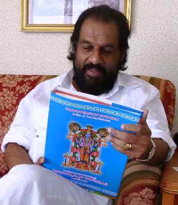 Sundara Narayana, whose real name was Vadakke Palazhy Narayanankutty Menon, entered the music field by accident. He was an environmental engineer by profession and had been a resident of New Jersey, USA for a major portion of his life, with his wife, Dr. Sreedevi, daughter, Dr. Lakshmi and son, Jaykumar, a computer engineer. Sundara Narayana began writing songs in praise of Lord Guruvayoorappan after his 60 th birthday in 1999.It all began with a dream he had, wherein Guruvayoorappan instructed him to write classical songs about Him. Untrained in formal music, he dismissed the dreams at first. However it became a recurring dream which compelled him to try. Inspired by devotion toward Guruvayoorappan he sat down to write his first song starting with “Hari Om Narayana”. To his own wonderment words came out of his mind as if “a tap was opened”. Since then he has composed over 220 songs as well as a dance-drama, Manjulacharitham, one of Guruvayoorappan's legendary miracles. All his krithis are in Sanskrit, Malayalam or Manipravalam (Sanskrit- Malayalam). A few are in Hindi. Some of the songs he composed were Bhajans and a few were Thiruvathira songs. Most of the songs were in praise of Guruvayurappan. He also wrote songs in praise of Poornathrayesa, Ganesha, Devi and Ayyappa. Two songs about Swami Chinmayananda were also composed by him. The music community of New York and New Jersey gradually started appreciating and accepting these songs. Many prominent musicians started singing them in kacheris. In 2001, famous Carnatic musician Dr. Omanakutty, herself a devotee of Guruvayoorappan, came to know of Sundara Narayana's story and expressed willingness to help in his mission to promote these songs. In 2002, Dr. Omanakutty, the favorite disciple of the legendary Dr. Semmangudi Srinivasa Iyer and Head of Kerala University Department of Music, sang these krithis at Guruvayoorappan temple in Guruvayur. At that time, Sundara Narayana produced a 2 CD album rendered by Omanakutty. Soon many other CDs were produced which were rendered by Dr. Omanakutty, Dr. Sreevalsan J Menon ,Sri Muraleedharan Unny, Sri Shenkottai HariHara Subramanian,and Pranavam Sankaran Nambuthiri . All these Musicians have sung these songs in Melpattur Auditorium, Guruvayur and other venues in Kerala and USA. The Guruvayurappan Temple of New Jersey, Nair Benevolent Association of New York, Carnatic Music association of North America (CMANA) and other organizations in the United States honored him with accolades in 2012. Manjula Charitham was presented as a dance drama in Bharathanatyam style by Rema Rao and group in Melpattur Auditorium in Guruvayur and by Chitra Venkateswaran and group in Guruvayurappan Temple, New Jersey. In July 2013, a new CD of Bhajans was released,which was sung by Biju Narayanan and group. Some songs in each CD are reproduced in this website. Sundara Narayana left his mortal body on March 31st2013. His Bhakthi filled compositions continue to inspire devotes worldwide.